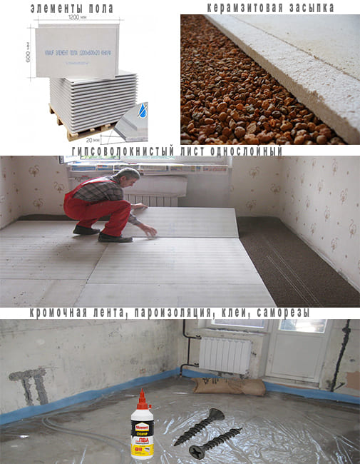Основные компоненты — это мелкофракционный керамзит и элемент пола, вспомогательные это пароизоляция, кромочная лента, клеящая мастика, скрепляющие саморезы, улучшающие свойства сухой стяжки, которые укладываются в слое стяжки это могут быть имеющие достаточную жёсткость звуко-теплоизоляционные материалы – например плиты пеноплекса.